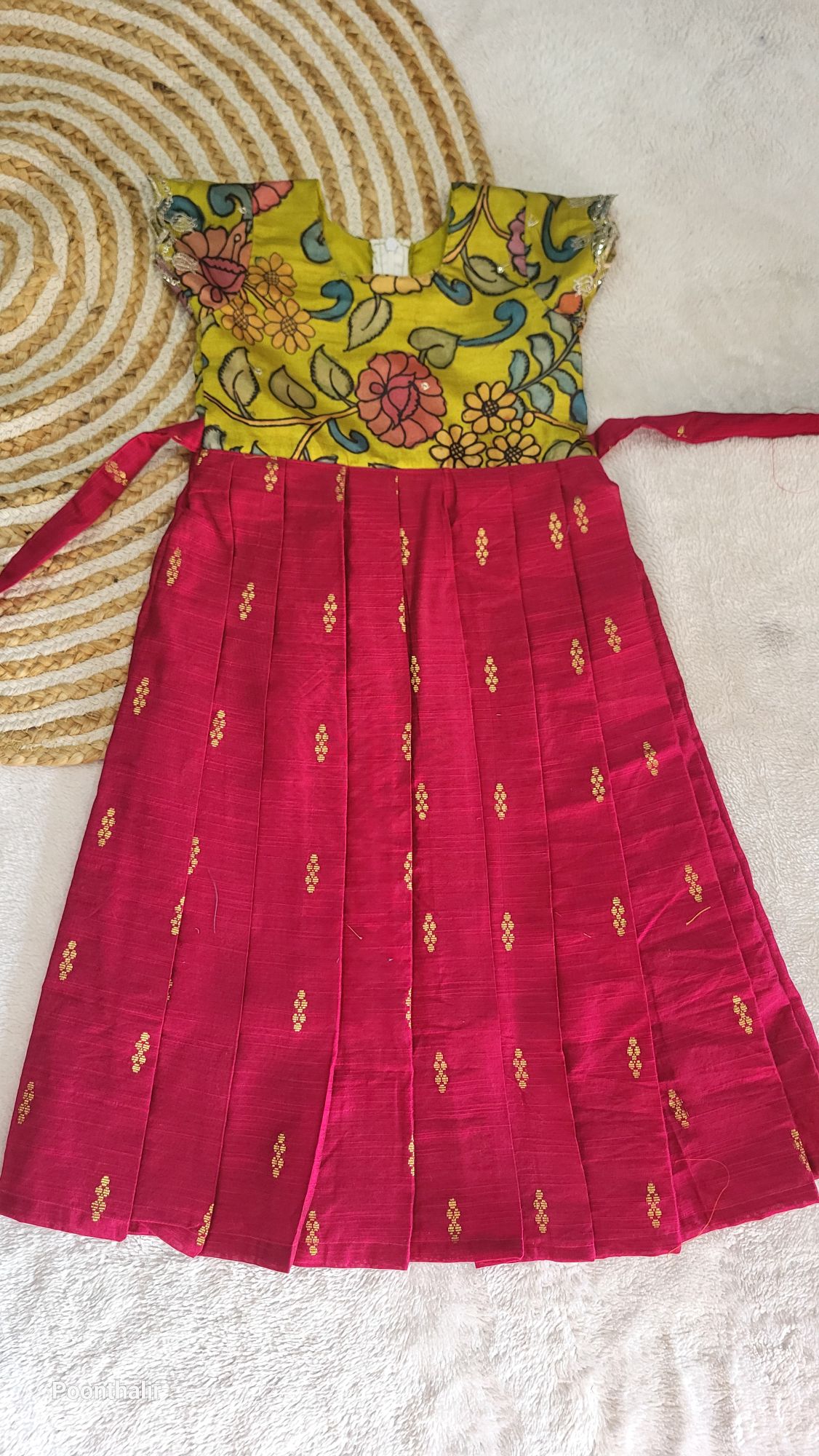 This is a beautiful traditional ethnic frock for a baby girl, designed with a bright and festive look.